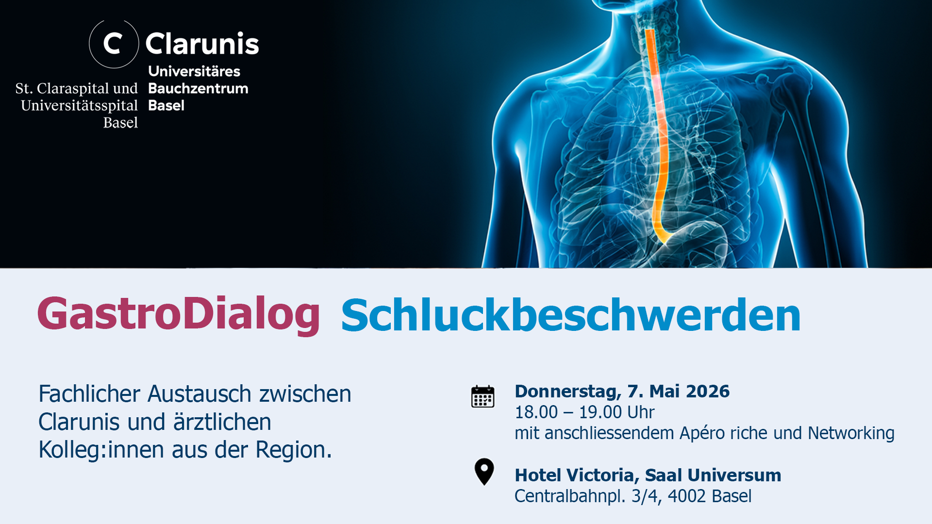 Mit der neuen Fortbildungsreihe bietet Clarunis für Viszeralchirurg:innen und Gastroenterolog:innen ein Format mit Fachvorträgen und persönlichem Austausch mit anschliessendem Apéro riche.