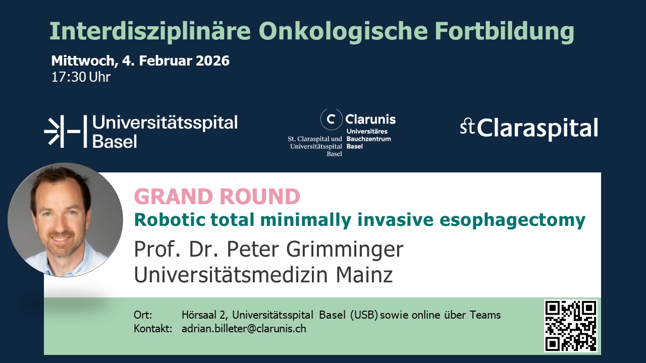 Die interdisziplinäre onkologische Fortbildung des Universitätsspitals Basel, Claraspitals und von Clarunis – normalerweise jeden Mittwoch – behandelt Themen rund um die gastrointestinale Onkologie. Dabei stehen neue Technologien und operative Ansätze (z. B. Roboter-assistierte Chirurgie) aber auch neue onkologische Studien und Therapieansätze im Fokus.