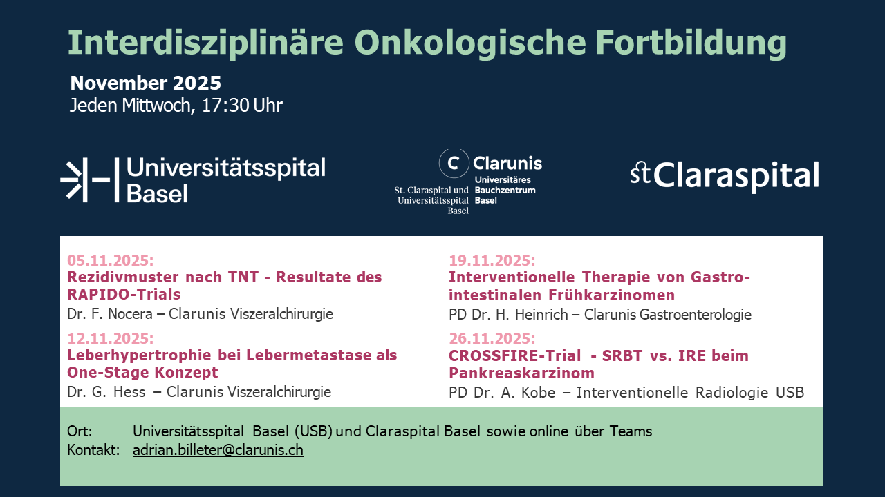 Die interdisziplinäre onkologische Fortbildung des Universitätsspitals Basel, Claraspitals und von Clarunis behandelt Themen rund um die gastrointestinale Onkologie. Dabei stehen neue Technologien und operative Ansätze (z. B. Roboter-assistierte Chirurgie) aber auch neue onkologische Studien und Therapieansätze im Fokus.
