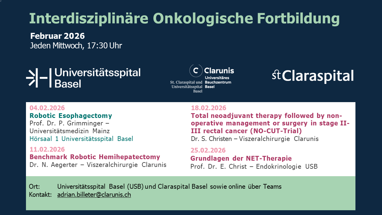 Die interdisziplinäre onkologische Fortbildung des Universitätsspitals Basel, Claraspitals und von Clarunis behandelt Themen rund um die gastrointestinale Onkologie. Dabei stehen neue Technologien und operative Ansätze (z. B. Roboter-assistierte Chirurgie) aber auch neue onkologische Studien und Therapieansätze im Fokus.